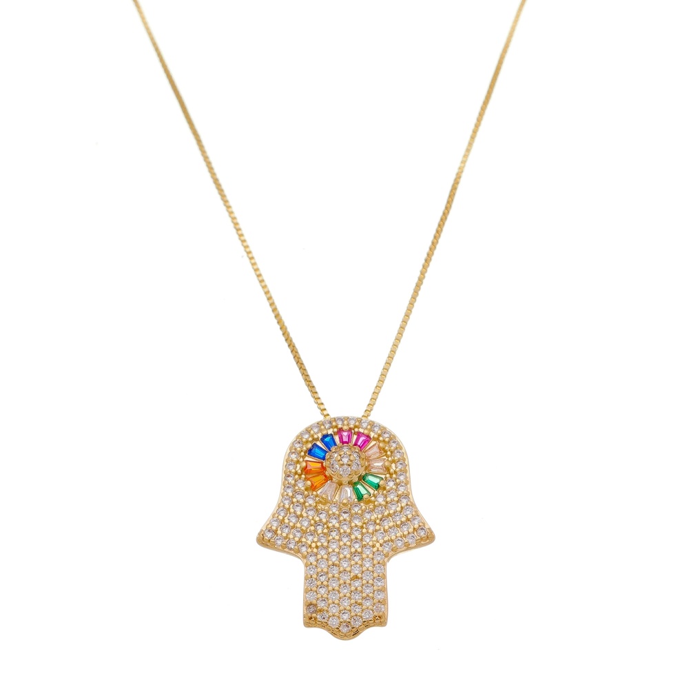 Colar Mão de Fátima Cravejado Detalhes Zircônia Colors Banhado a Ouro 18K exclusivo com design feito para você.